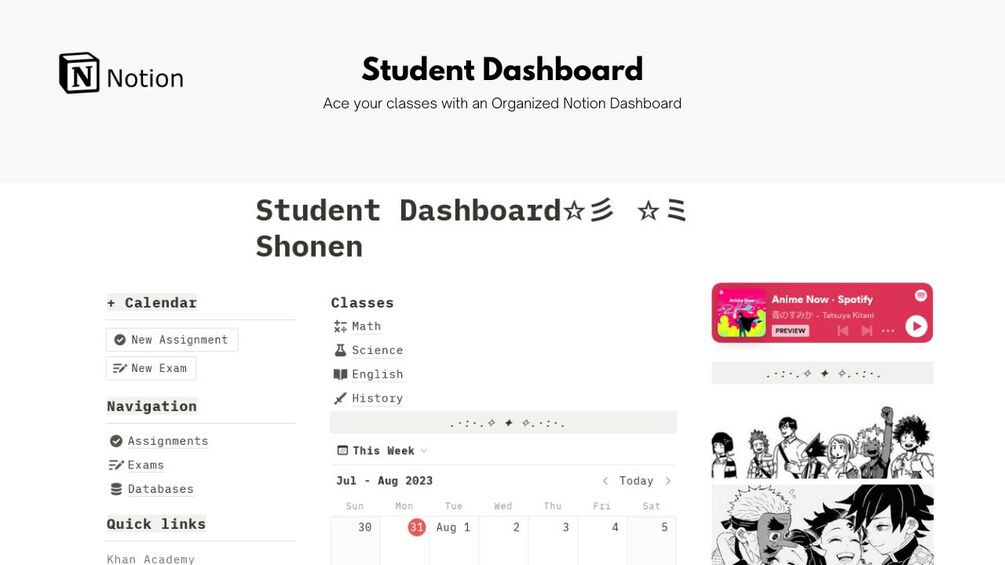 The Manga Shonen version of this template has the same features of the basic Student Dashboard but is decorated for the those who that love the manga.
