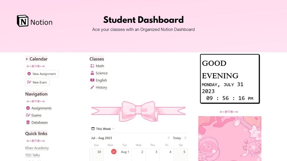 The Pink Kawaii version of this template has the same features of the basic Student Dashboard but is decorated for the those who that love the Pink Kawaii Aesthetic